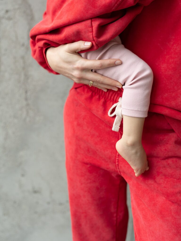 • Długie, luźne spodnie/legginsy (2 pary): Do założenia na body z długim rękawem. Bawełniane, bambusowe.