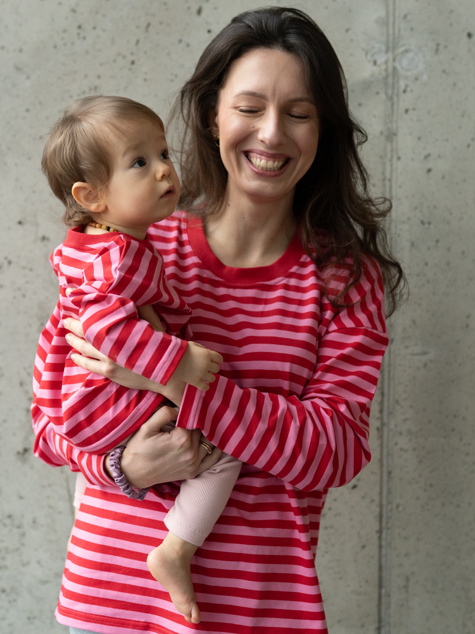 Wygodna i modna koszulka z długim rękawem dla dziecka w różowo-czerwone paski. Uszyta z elastycznego, oddychającego dżerseju.