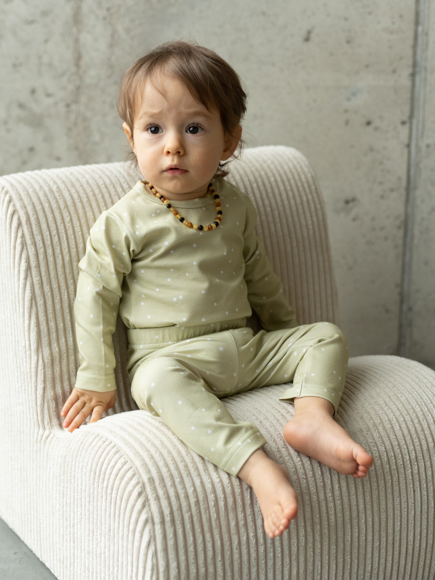 Wygodne body niemowlęce w unikalnym kolorze trawy cytrynowej z motywem kropeczek. Uszyte z elastycznej bawełny typu jersey.