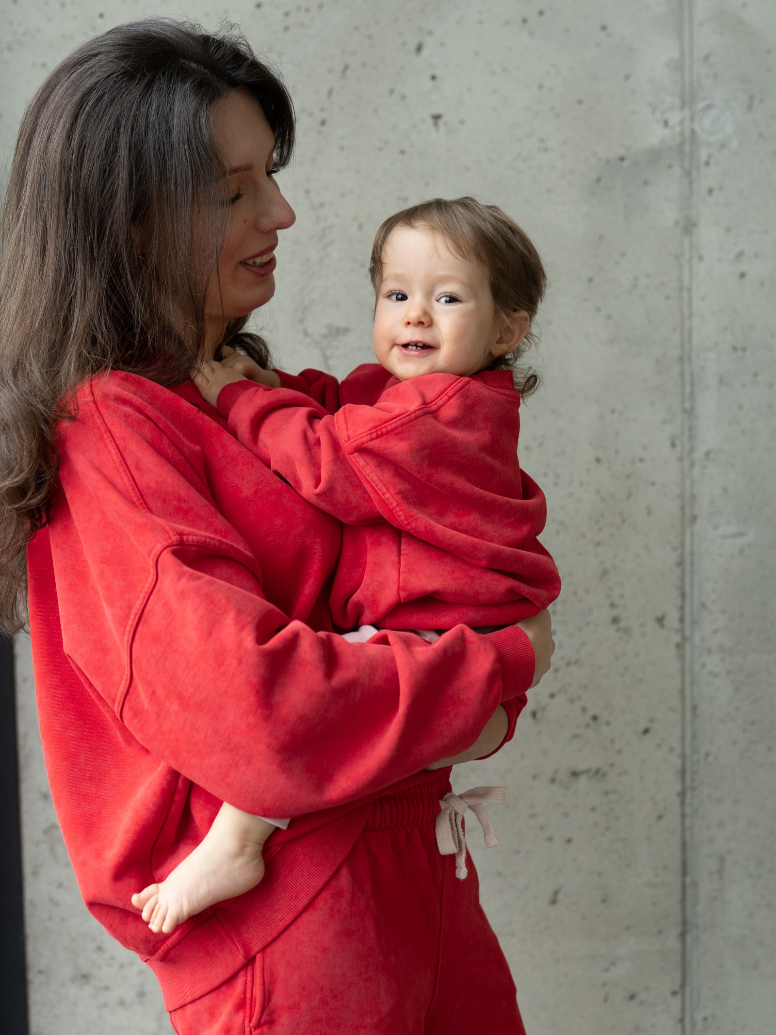 Unikalny kolor: Stonowana czerwień z efektem vintage wash (stylowe spranie). Kolor jest szlachetny, matowy i nie traci uroku w praniu.