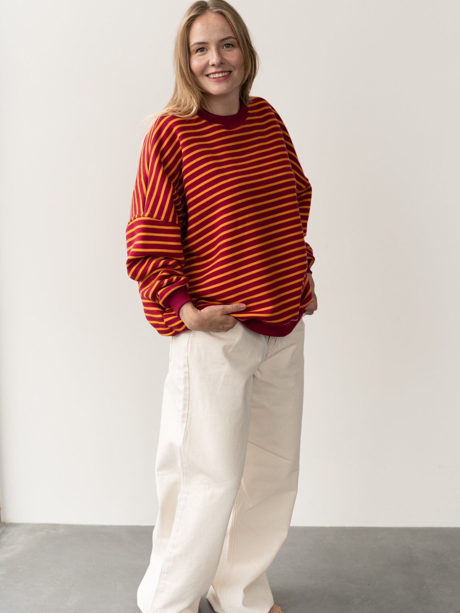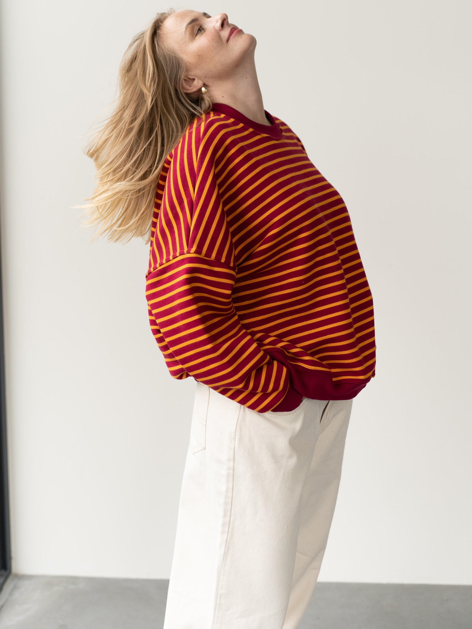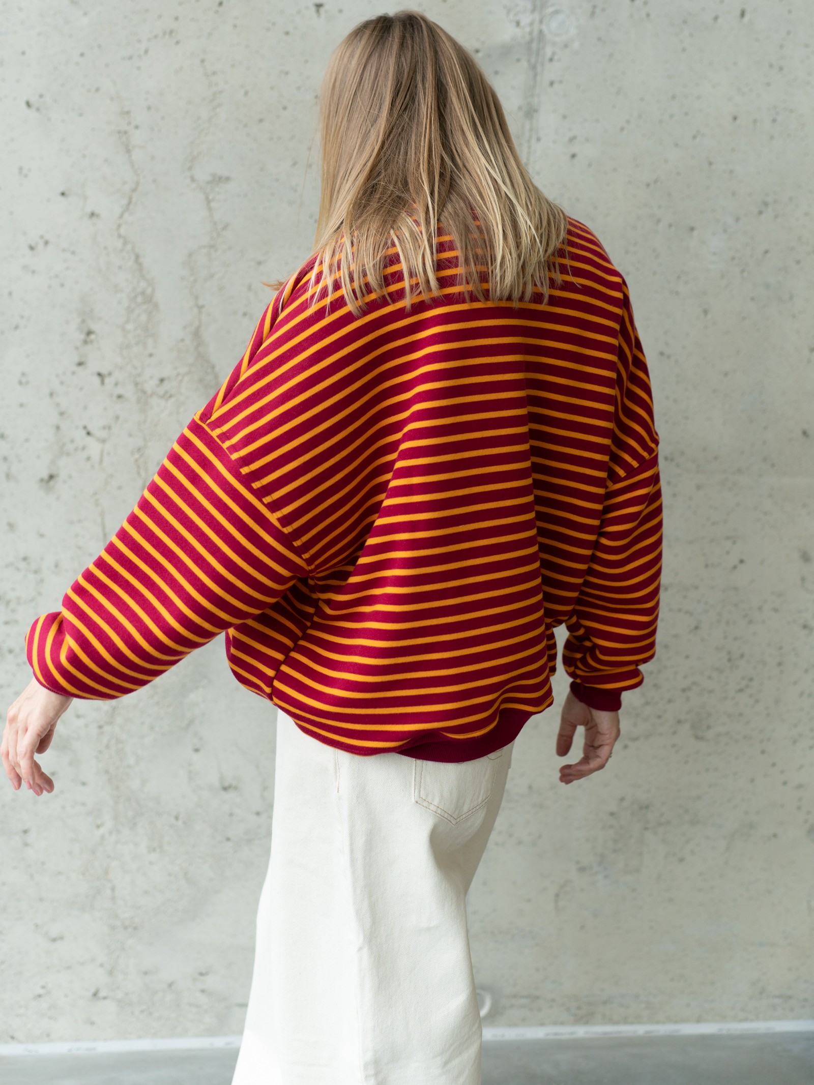 Luźny, oversize’owy krój i wykończenie ściągaczami gwarantują wygodę i swobodę ruchów, a ponadczasowy wzór w paski bordowo-pomarańczowe sprawia, że bluza pasuje zarówno do jeansów, jak i spodni dresowych.