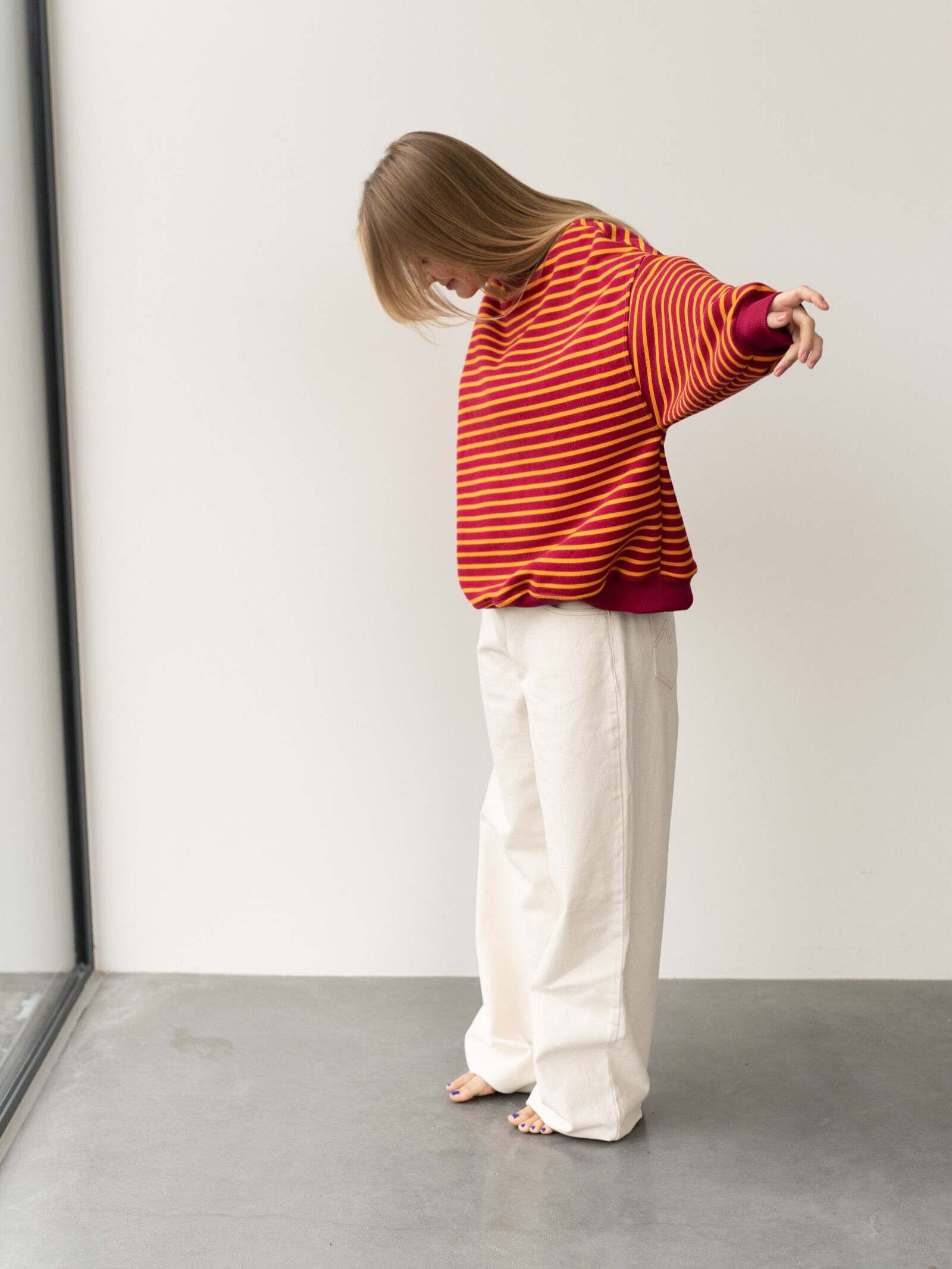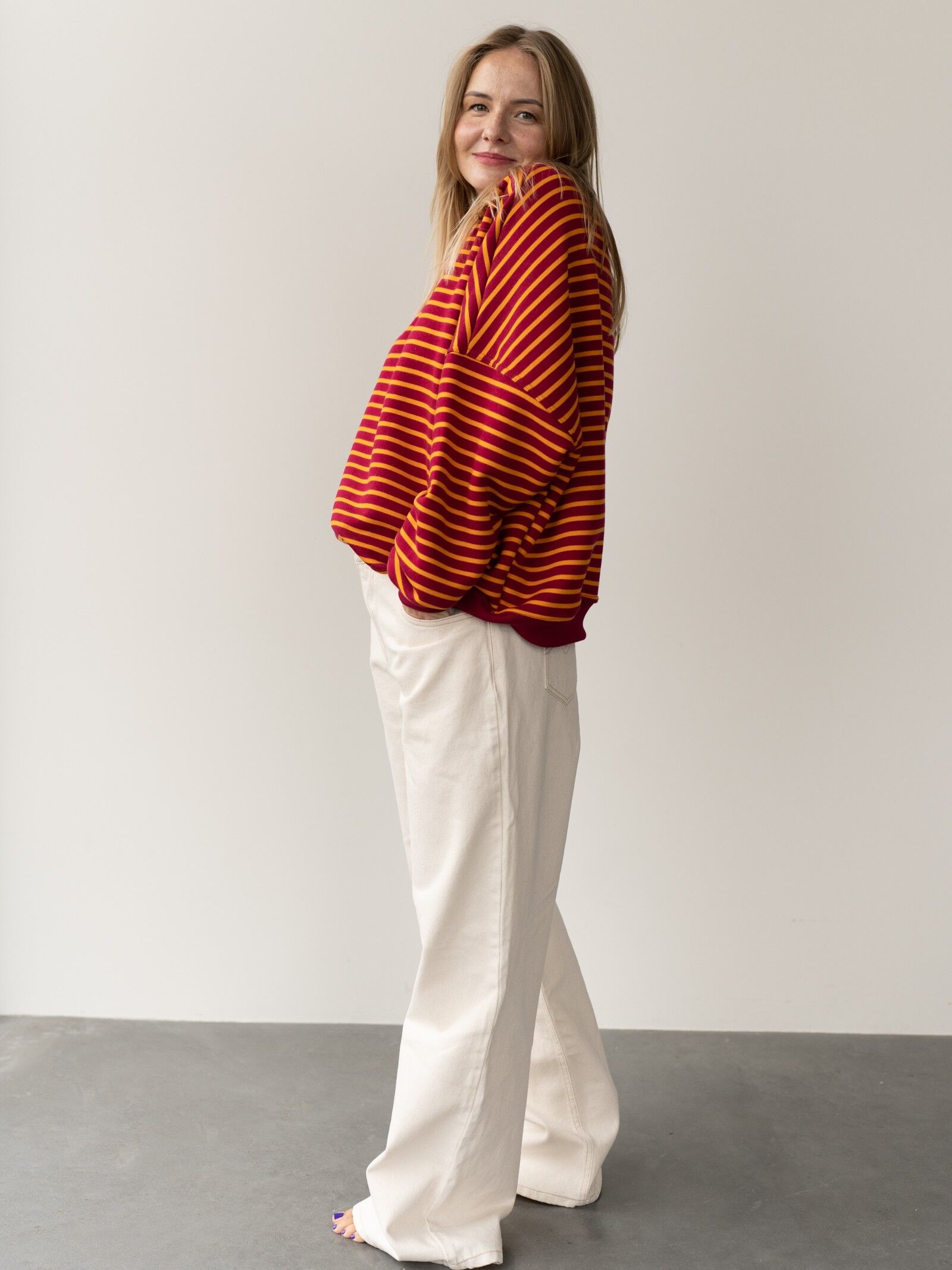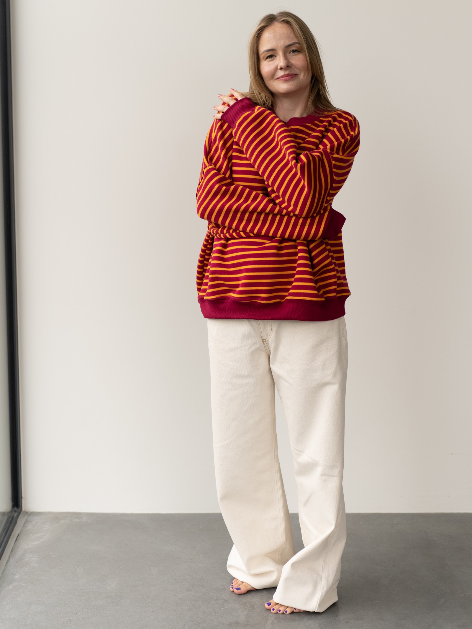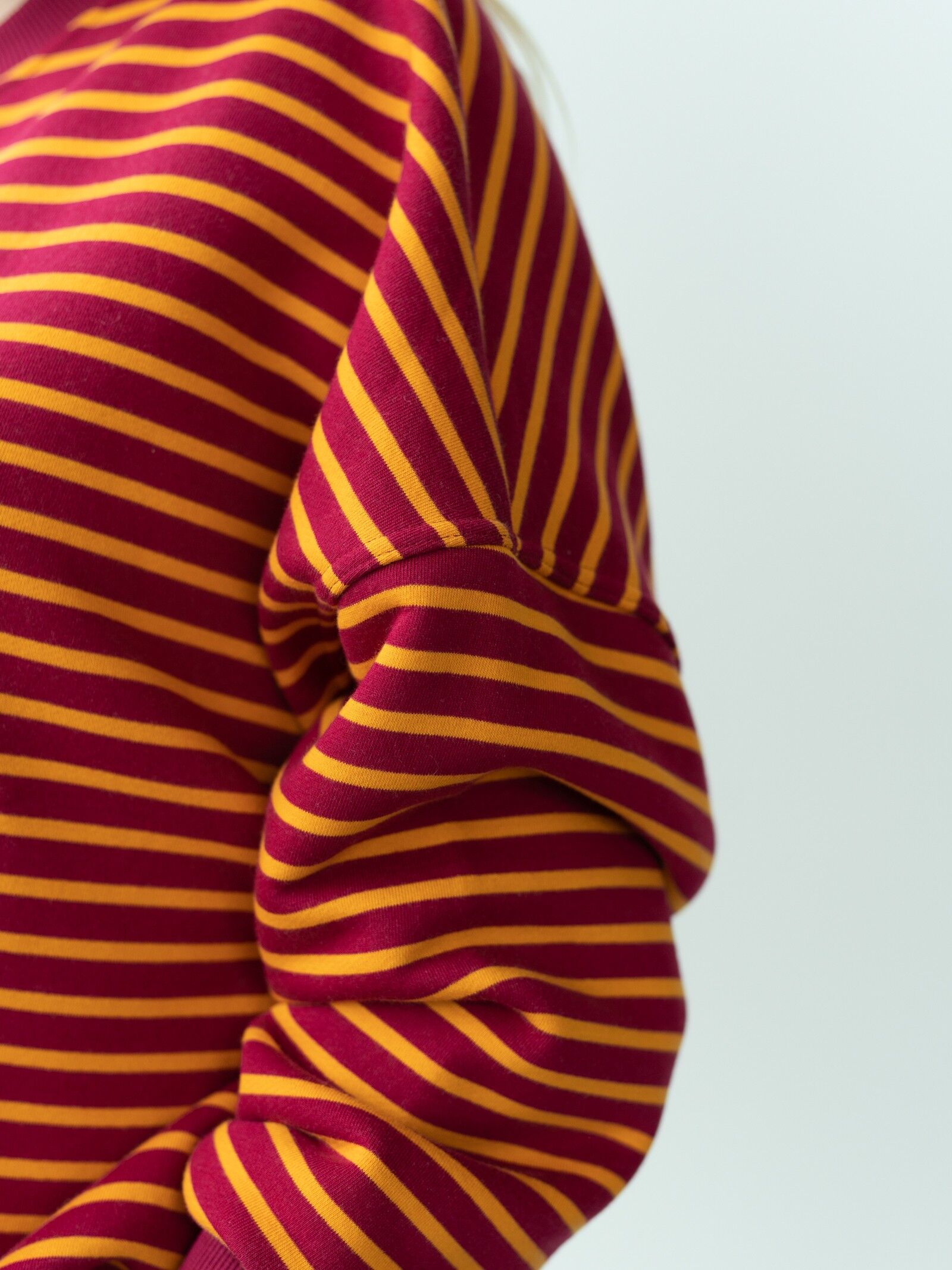 Luźny, oversize’owy krój i wykończenie ściągaczami gwarantują wygodę i swobodę ruchów, a ponadczasowy wzór w paski bordowo-pomarańczowe sprawia, że bluza pasuje zarówno do jeansów, jak i spodni dresowych.
