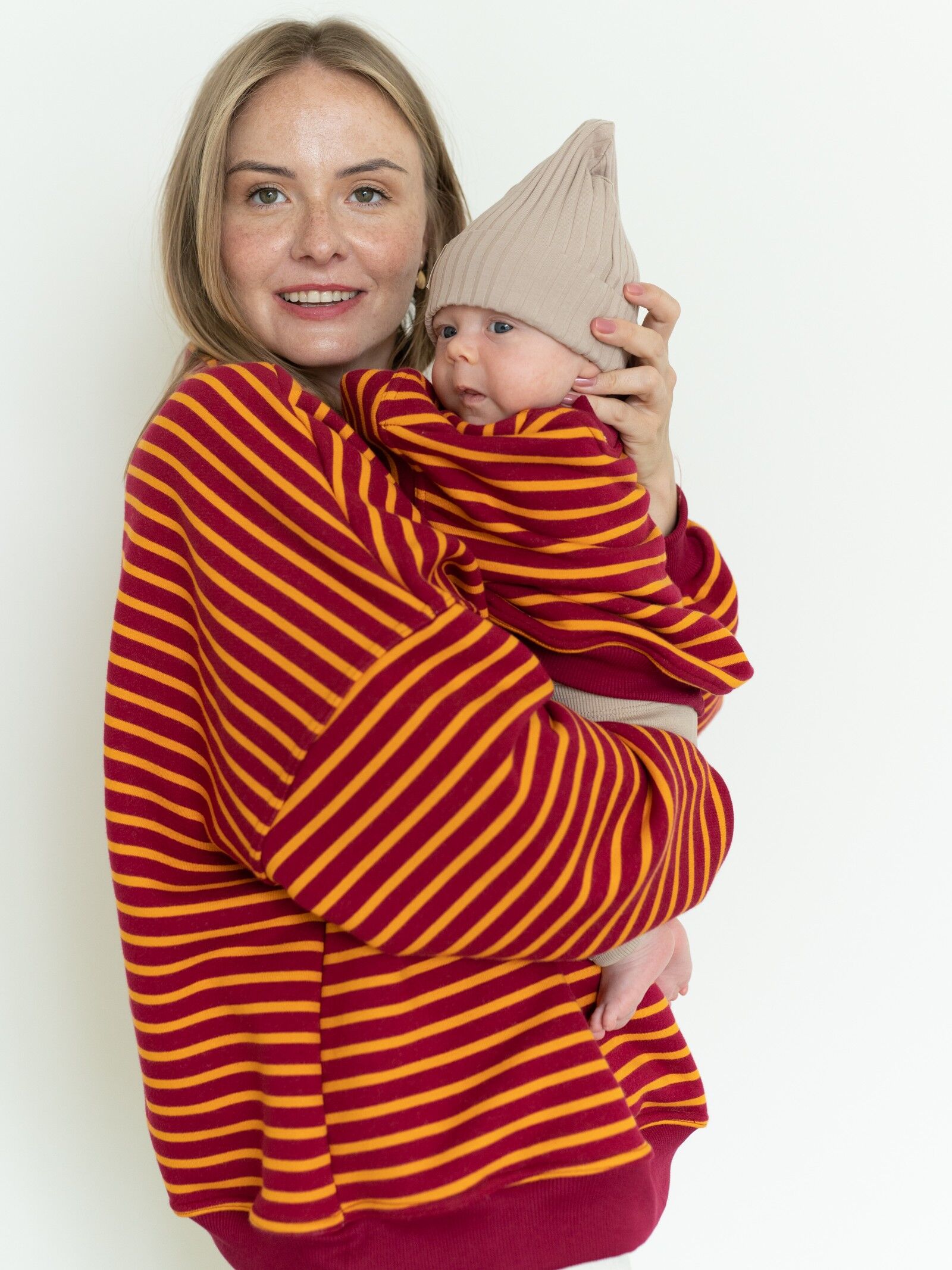 Luźny krój oversize i modne paski w odcieniach bordo i pomarańczu sprawiają, że bluza pasuje zarówno do jeansów, jak i spodni dresowych, tworząc wygodne, codzienne stylizacje. To model, który łączy komfort, bezpieczeństwo i ponadczasowy design. Bluza dostępna jest również w wersji dla mam, co daje możliwość stworzenia wyjątkowego zestawu matchy-matchy mama i dziecko.