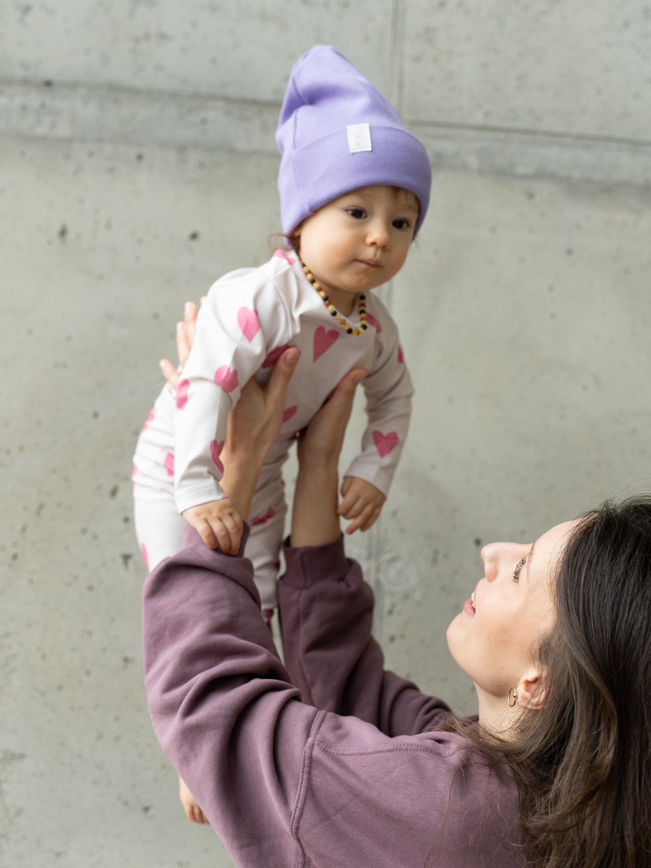 Urocze body niemowlęce w kolorze złamanej bieli (off-white) z delikatnym motywem różowych serduszek. Uszyte z najwyższej jakości elastycznej bawełny typu jersey.