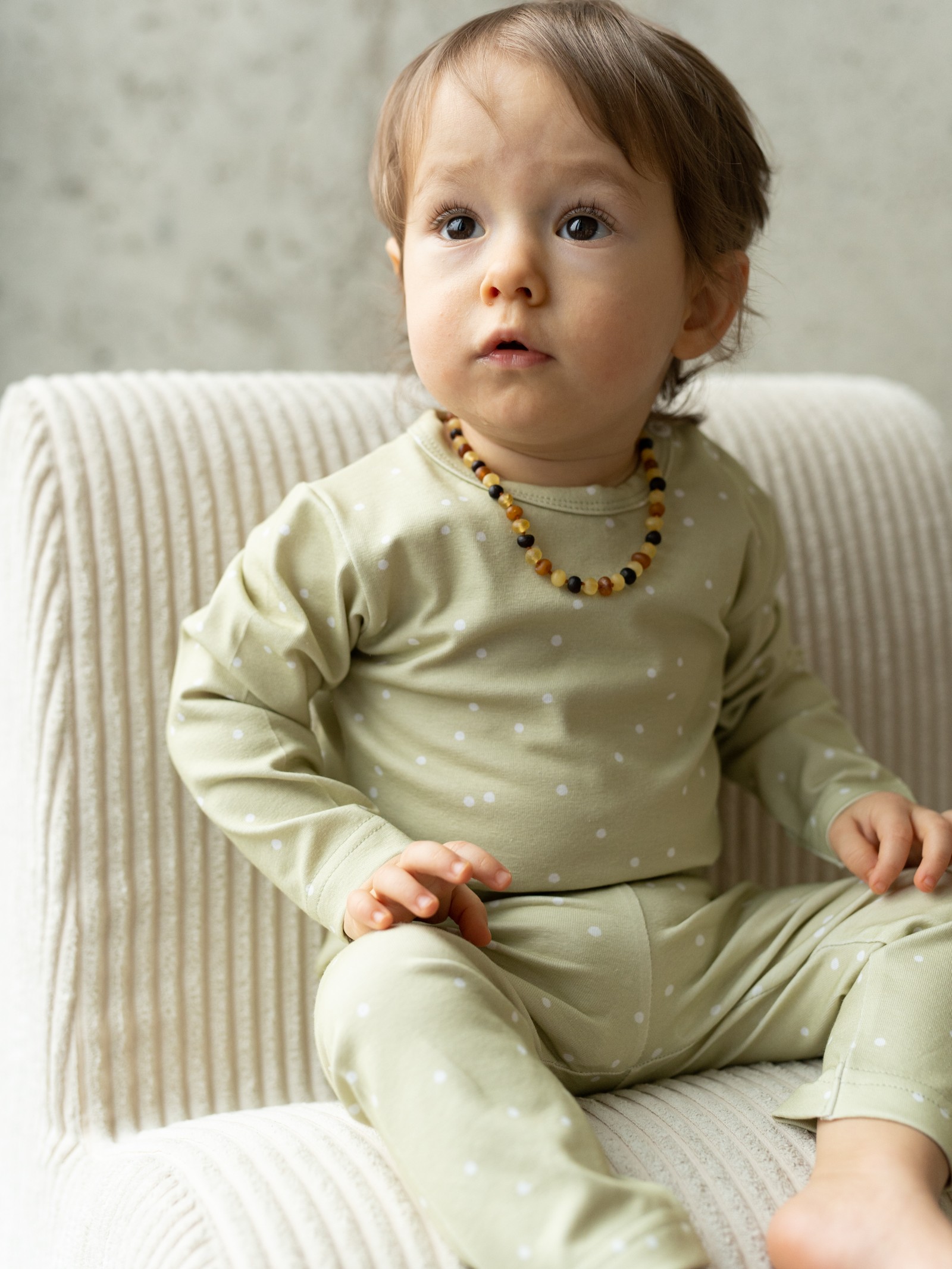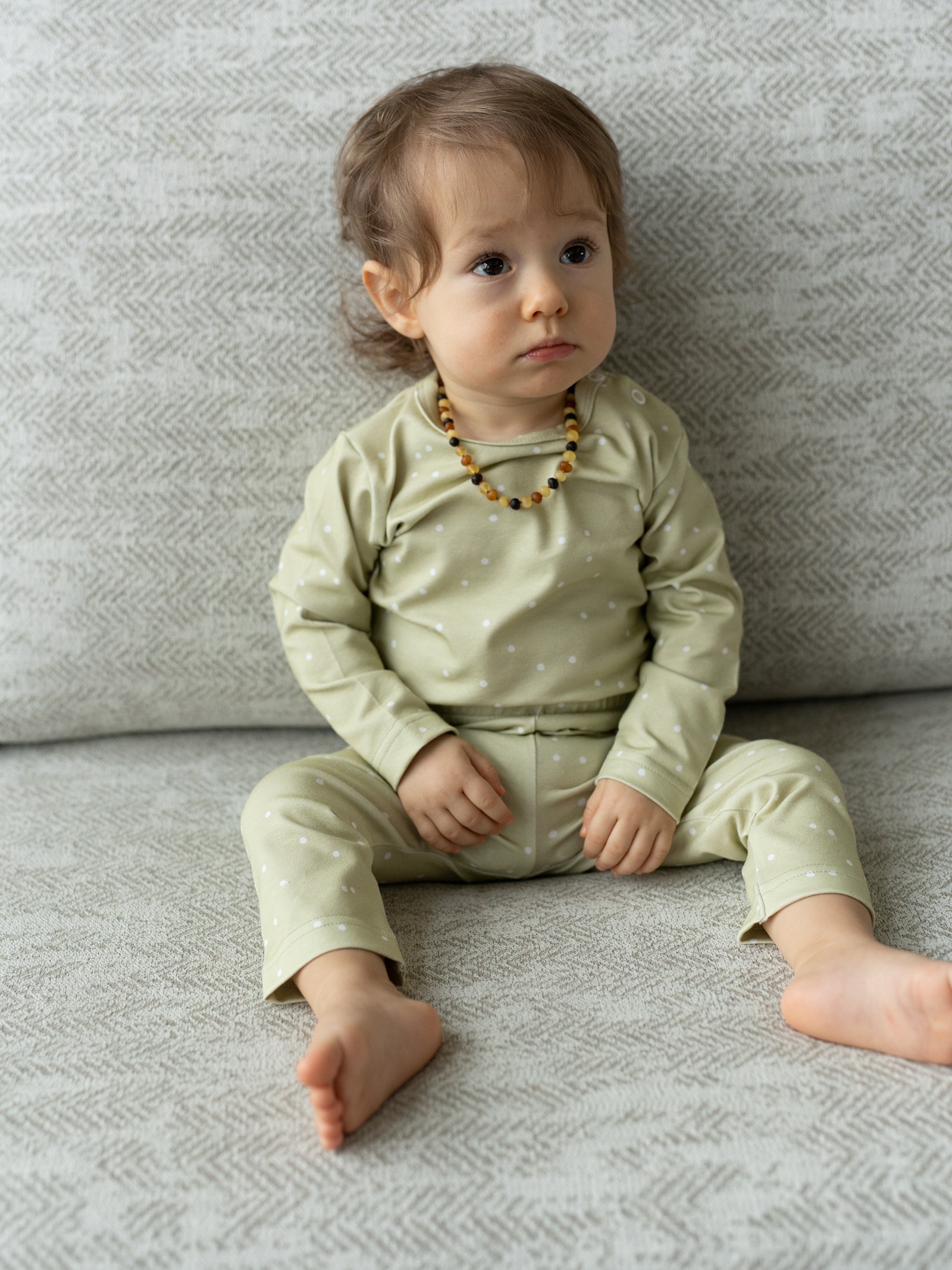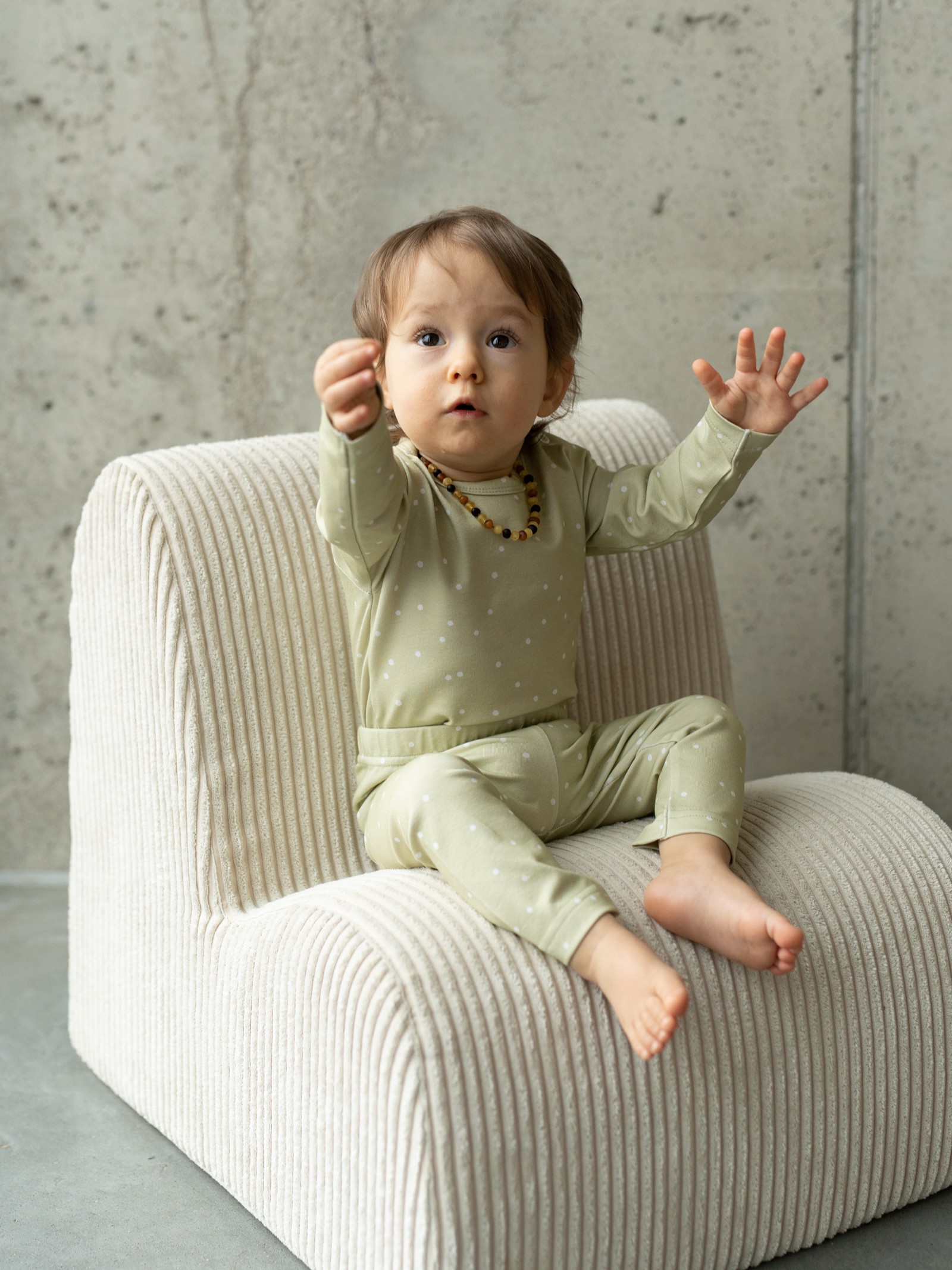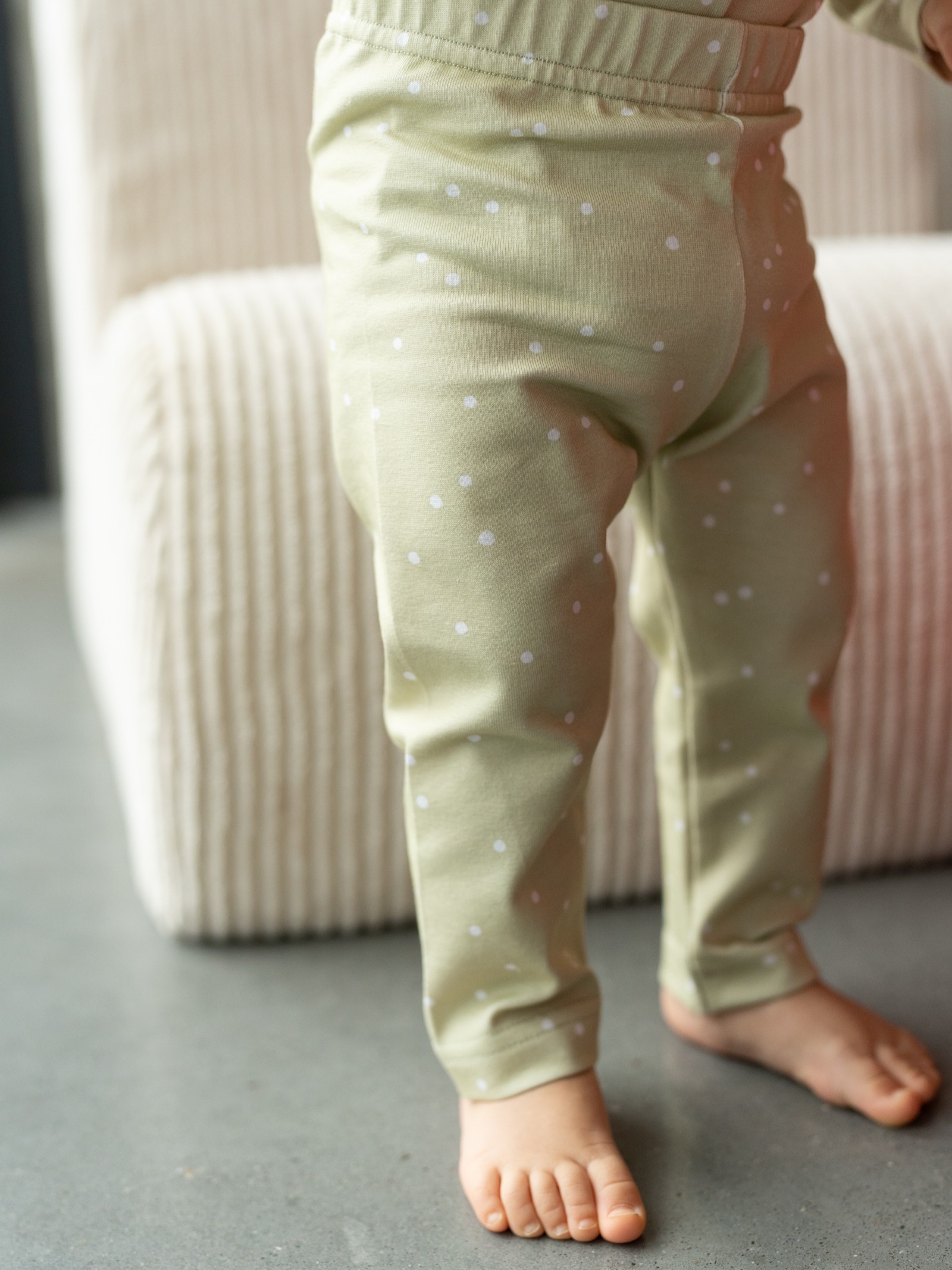 Wprowadź do garderoby swojego maluszka odrobinę słońca i natury. Legginsy Lemon Dots w odcieniu trawy cytrynowej (Lemon Grass) to nowoczesna alternatywa dla klasycznych błękitów i różów. Ten energetyczny, a zarazem kojący kolor, ozdobiony subtelnymi kropeczkami, sprawia, że każda stylizacja nabiera wyjątkowego charakteru. To model unisex – wygląda równie uroczo na chłopcu, jak i na dziewczynce.