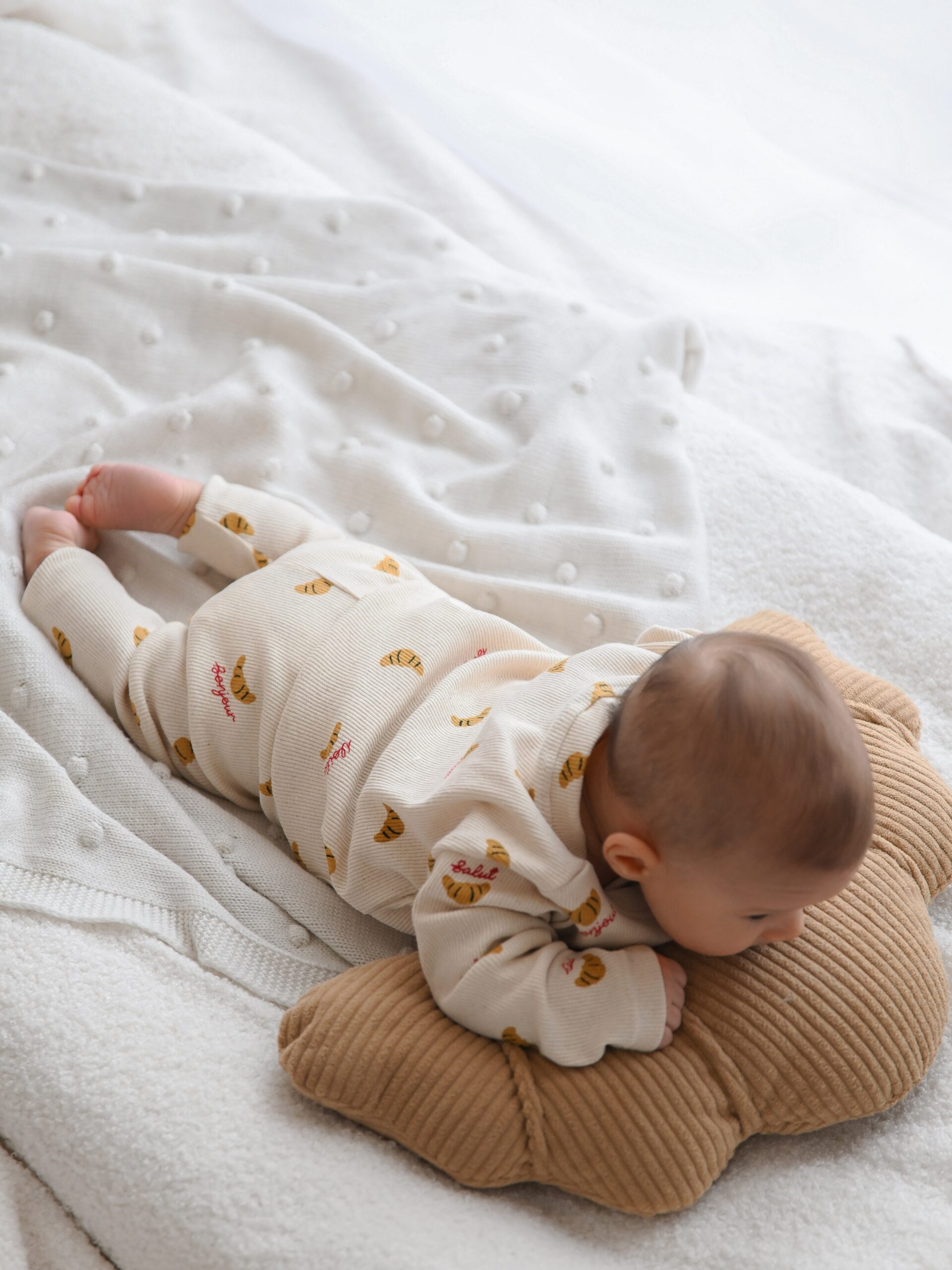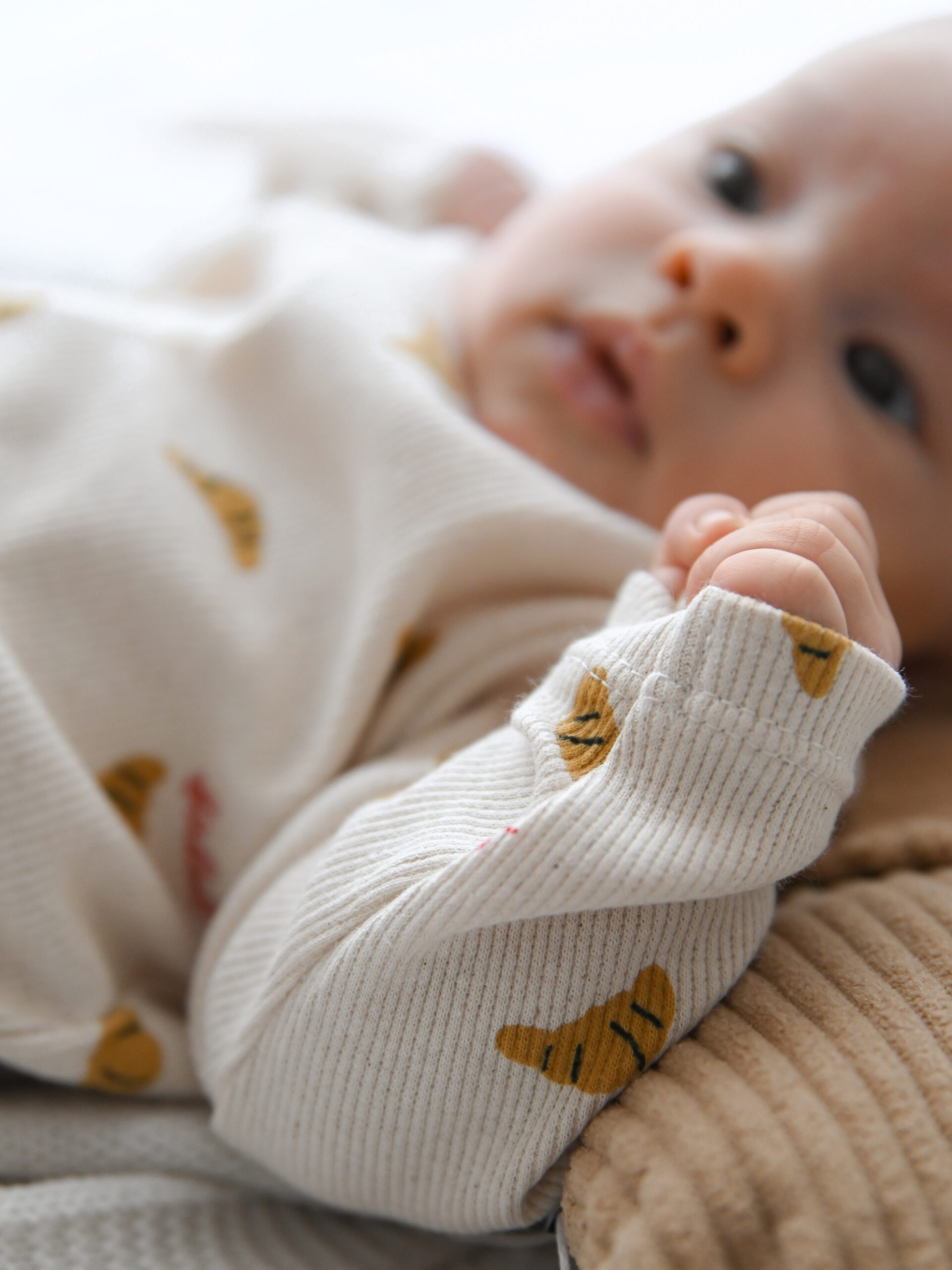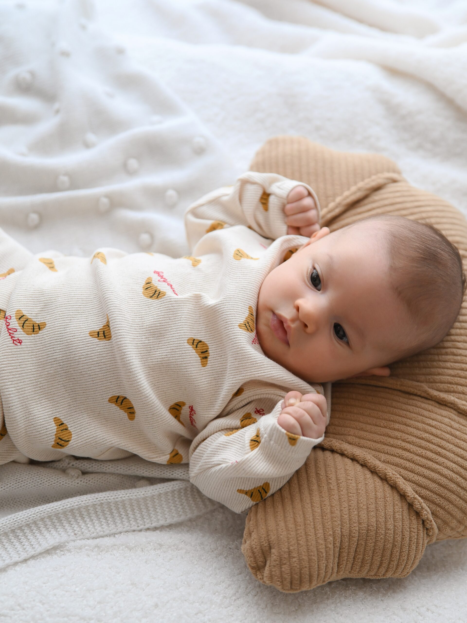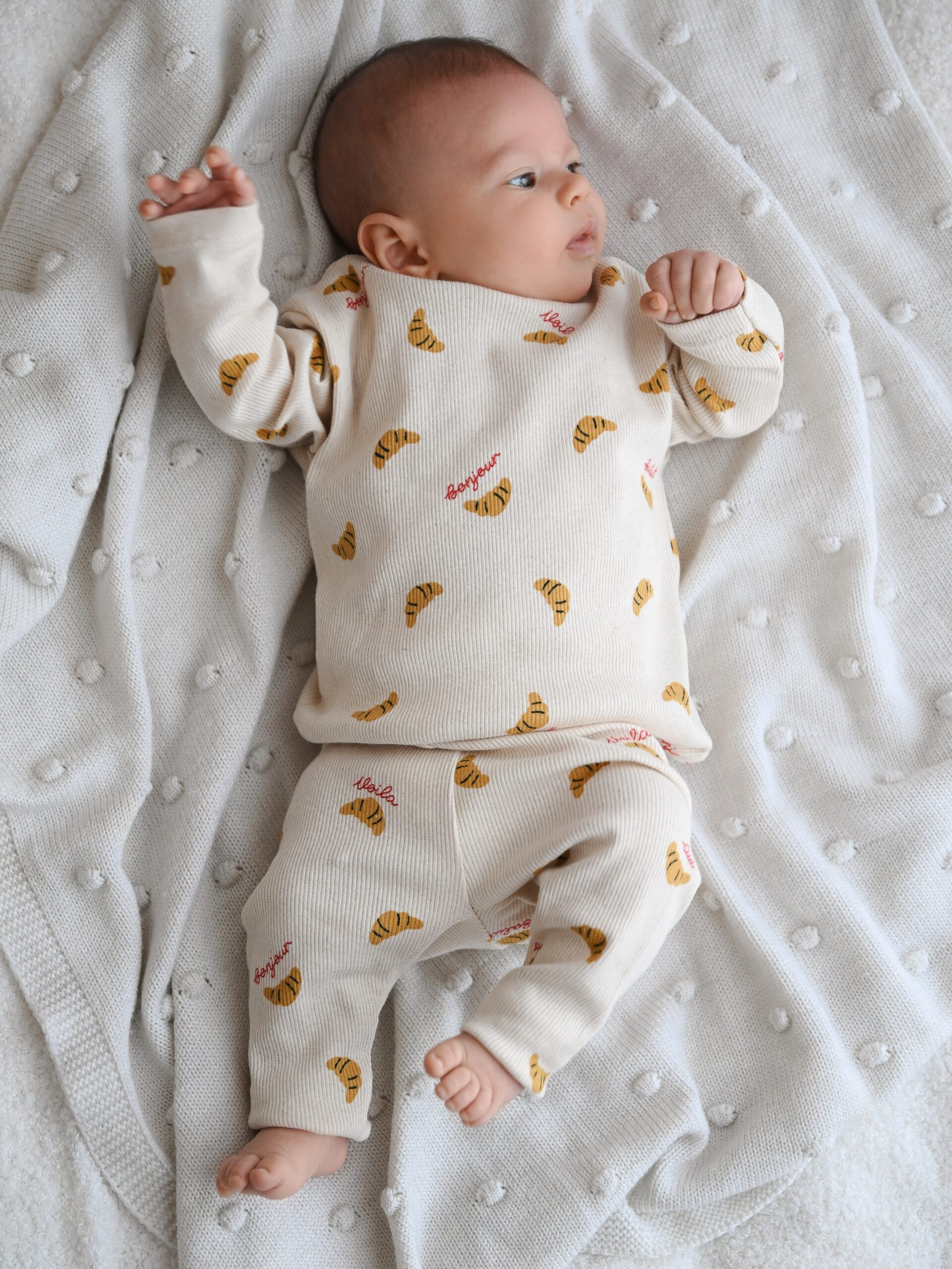 Wyjątkowo elastyczny longsleeve niemowlęcy wykonany z mięsistej dzianiny typu prążek. Ozdobiony apetycznym motywem croissantów i napisem „Bonjour”. Idealny wybór dla małych odkrywców, którzy cenią swobodę ruchów.