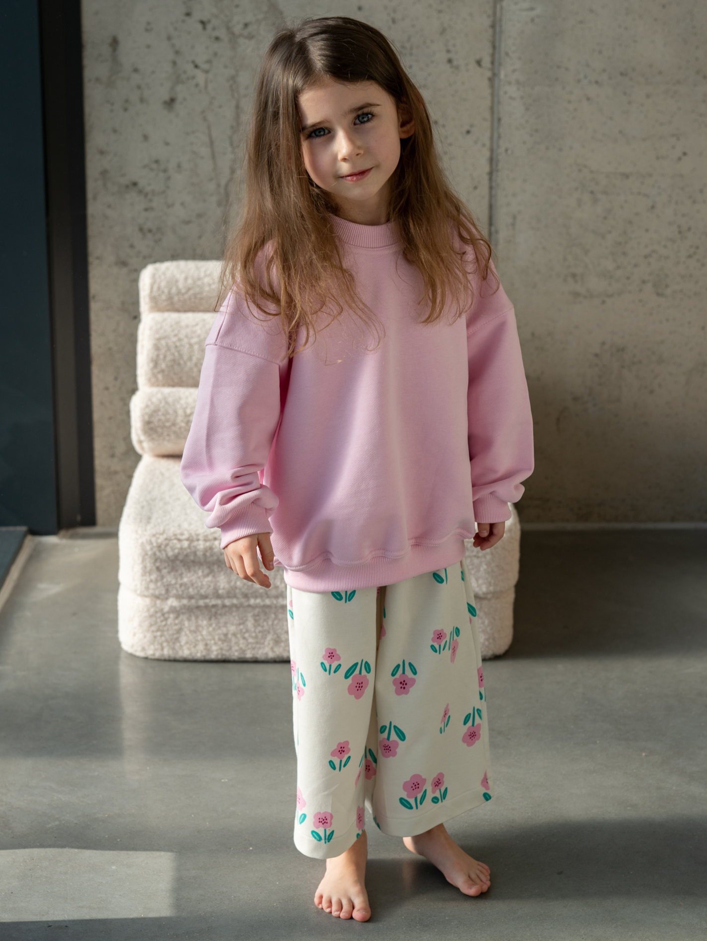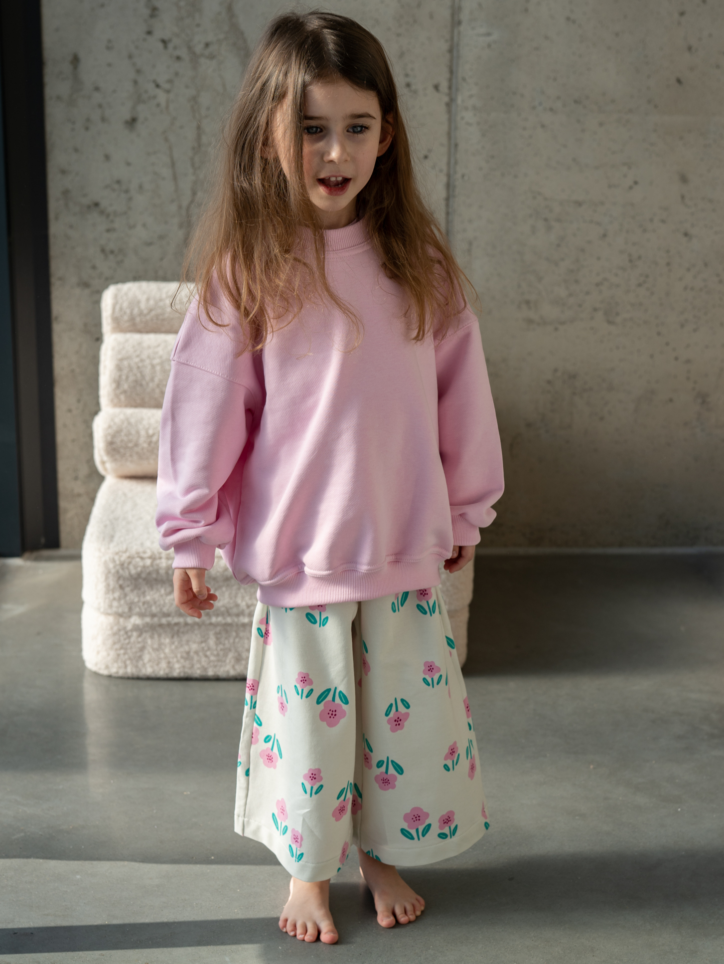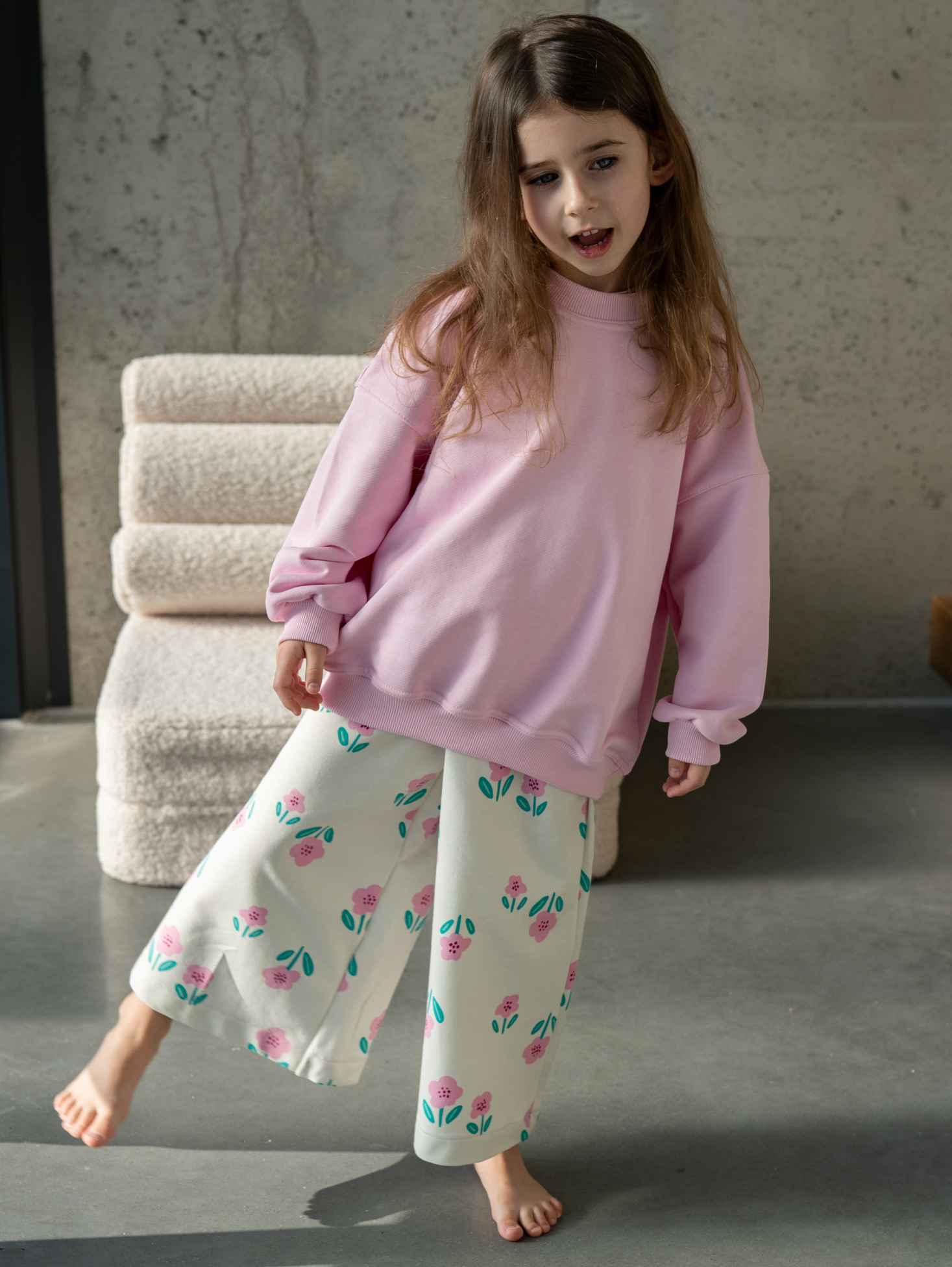 Spodnie typu culottes to doskonałe połączenie komfortu i stylu. Ich swobodny krój zapewnia pełną wygodę ruchów, a lekka, cienka dzianina dresowa sprawia, że są idealnym wyborem na ciepłe dni. Piękny kwiatowy wzór dodaje im uroku, czyniąc je wyjątkowym elementem dziecięcej garderoby.