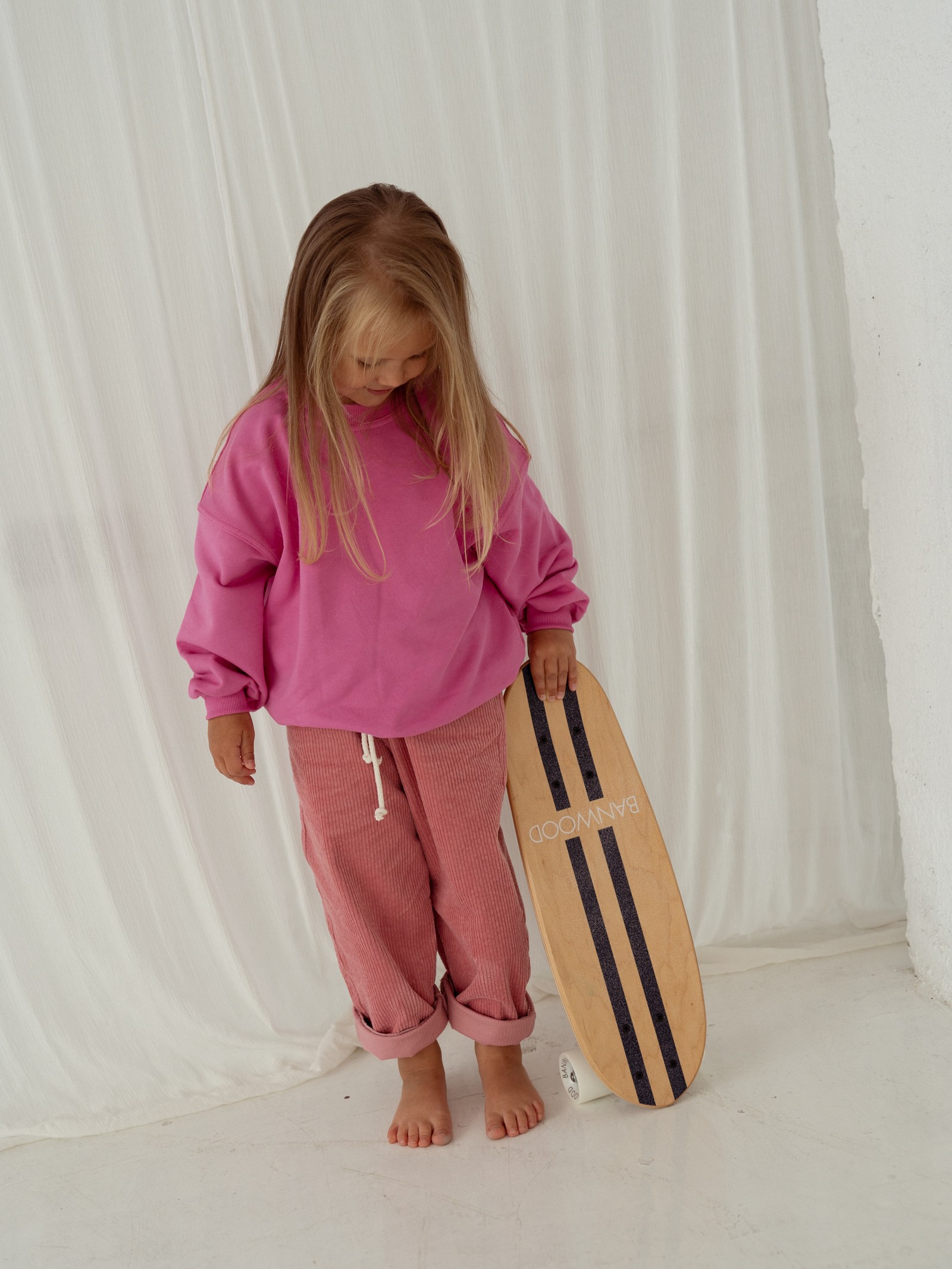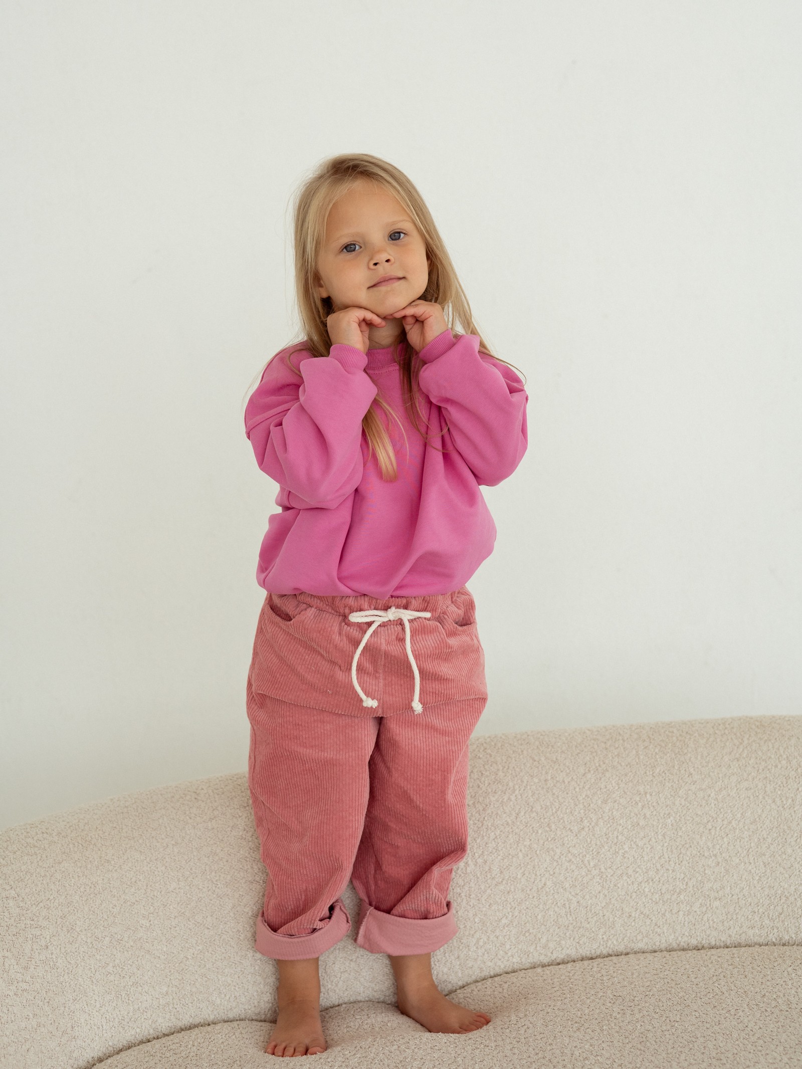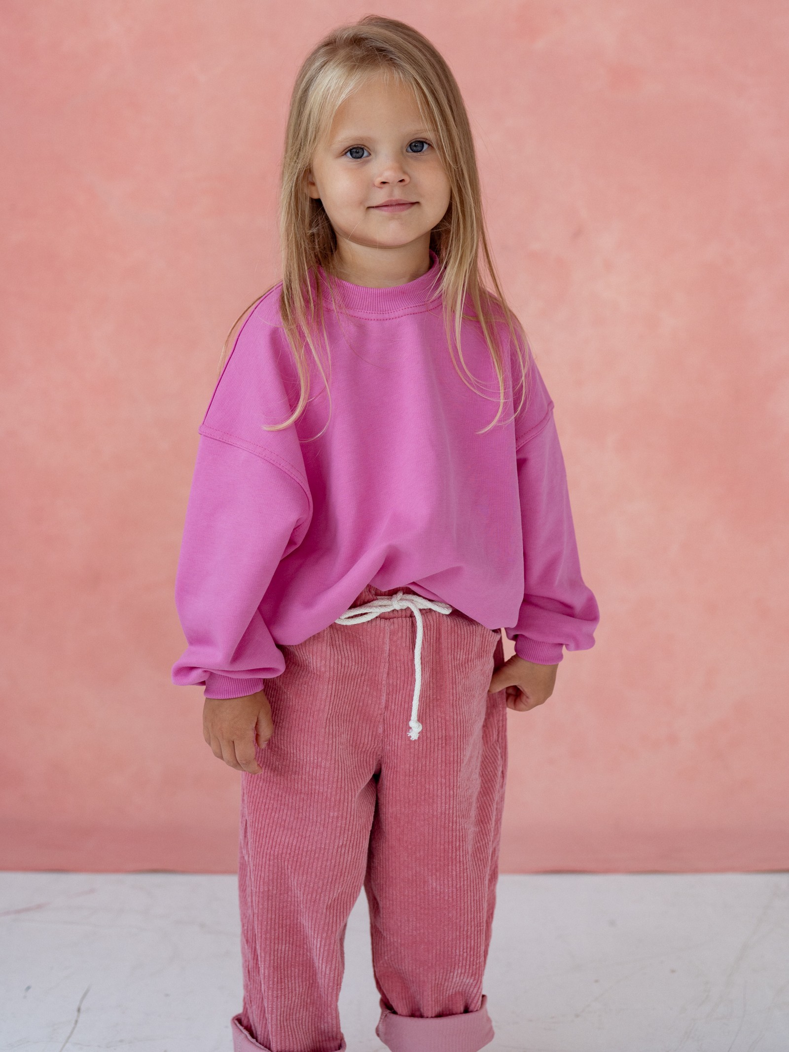 Spodnie dziecięce, uszyte z miękkiego sztruksu w kolorze zgaszonego różu to połączenie wygody, jakości i ponadczasowego stylu. Dzięki swobodnemu krojowi i regulowanemu sznurkowi w pasie zapewniają pełną swobodę ruchów i idealne dopasowanie, a wydłużona nogawka sprawia, że będą służyły dziecku dłużej niż standardowe modele.