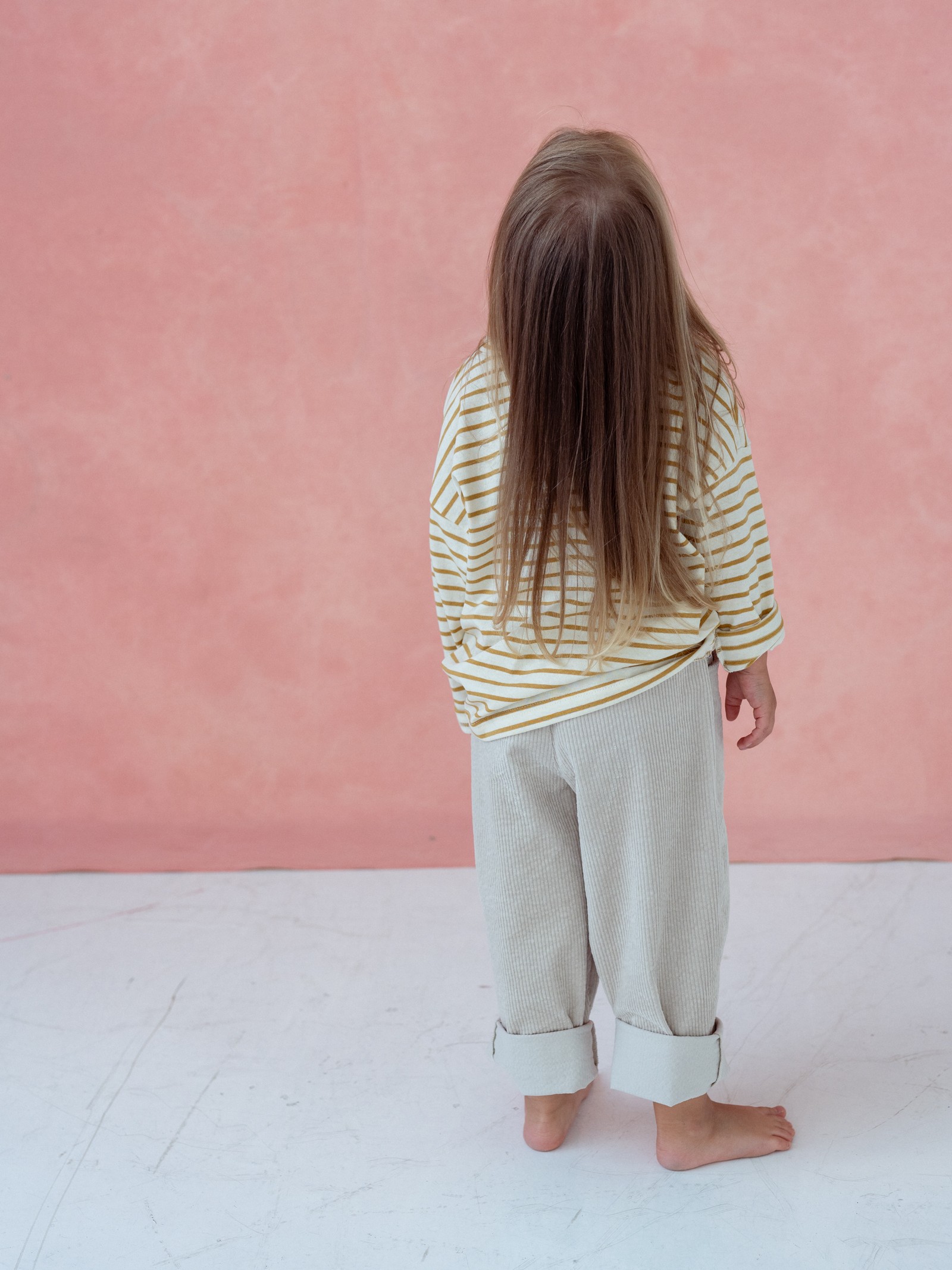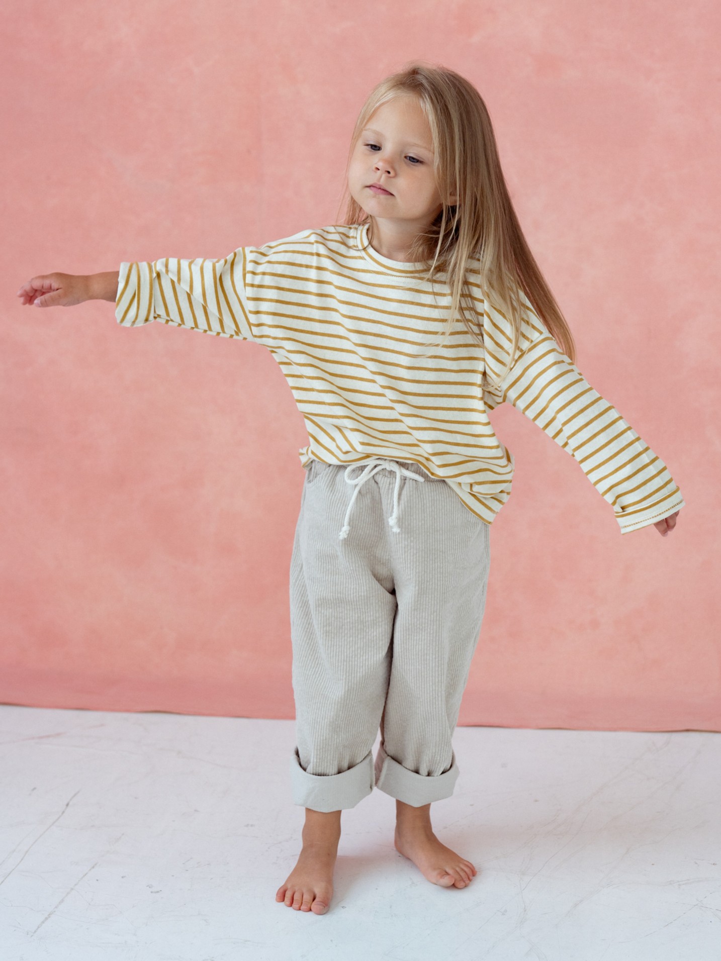 Spodnie mają praktyczne kieszenie, w których zmieszczą się wszystkie dziecięce skarby – od muszelek po ulubione drobiazgi. Neutralny, piaskowy odcień sprawia, że świetnie komponują się z wieloma stylizacjami, zarówno codziennymi, jak i bardziej eleganckimi.