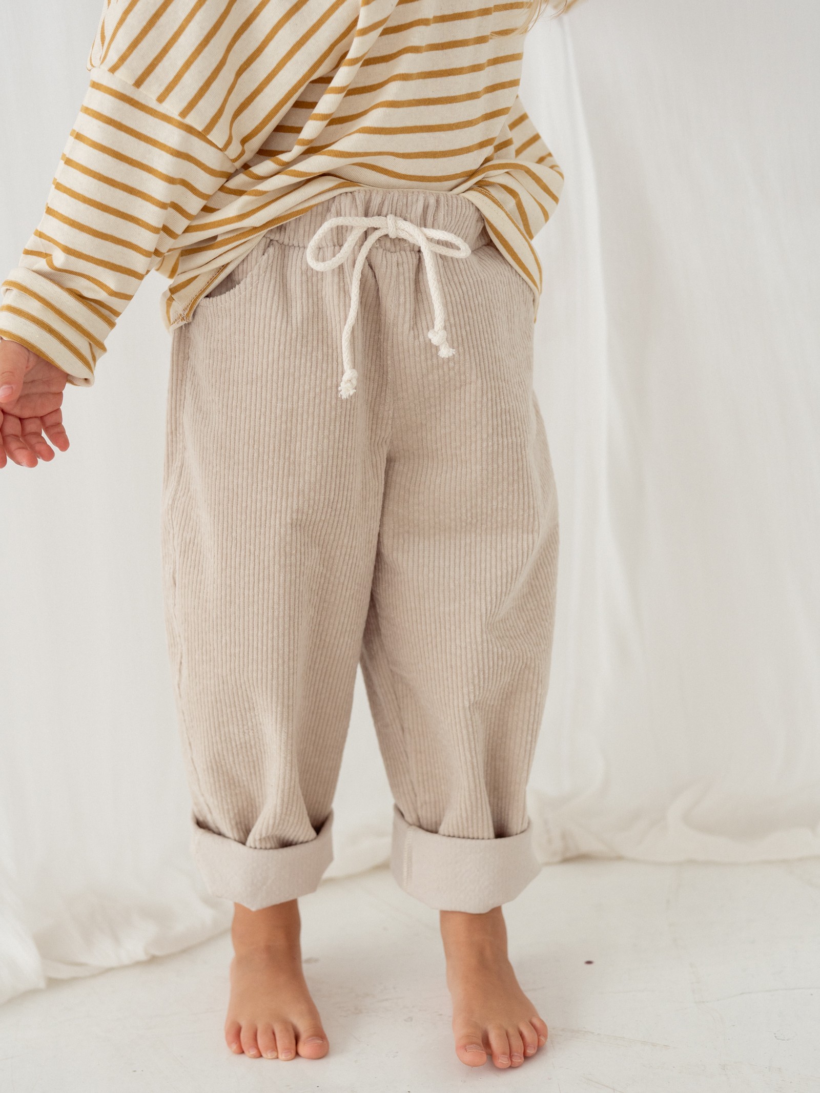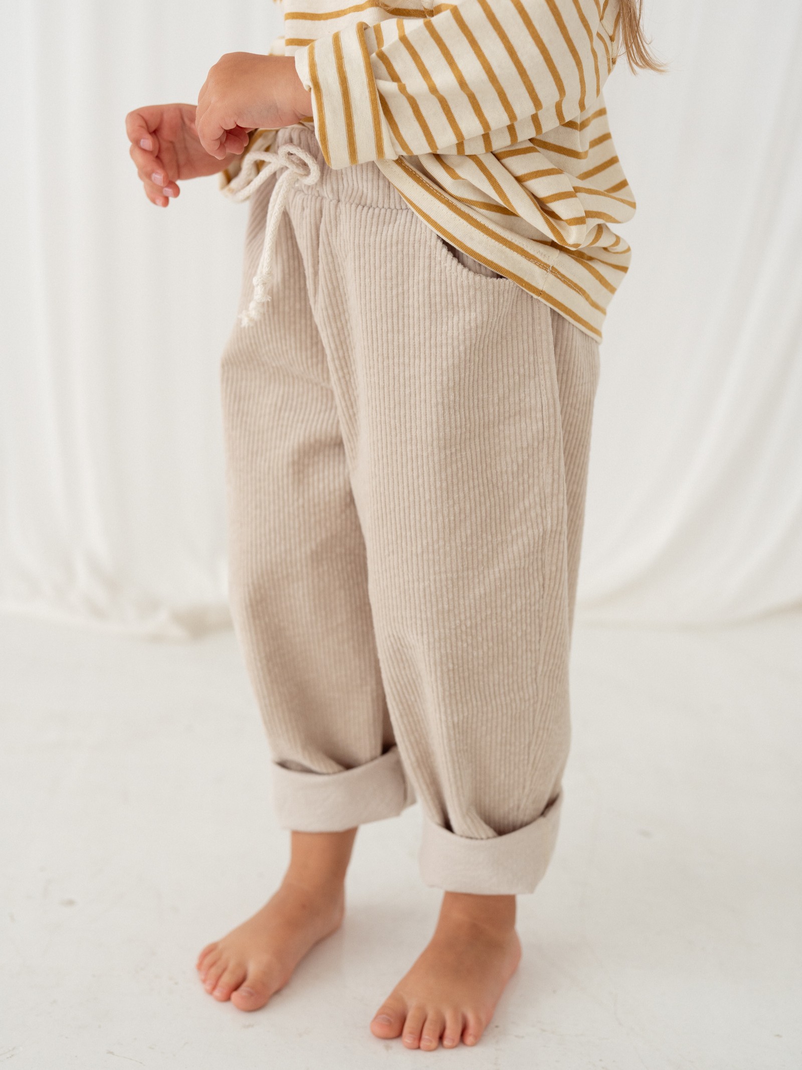 Spodnie dziecięce, uszyte z miękkiego sztruksu w kolorze jasnego piasku to połączenie wygody, jakości i ponadczasowego stylu. Dzięki swobodnemu krojowi i regulowanemu sznurkowi w pasie zapewniają pełną swobodę ruchów i idealne dopasowanie, a wydłużona nogawka sprawia, że będą służyły dziecku dłużej niż standardowe modele.