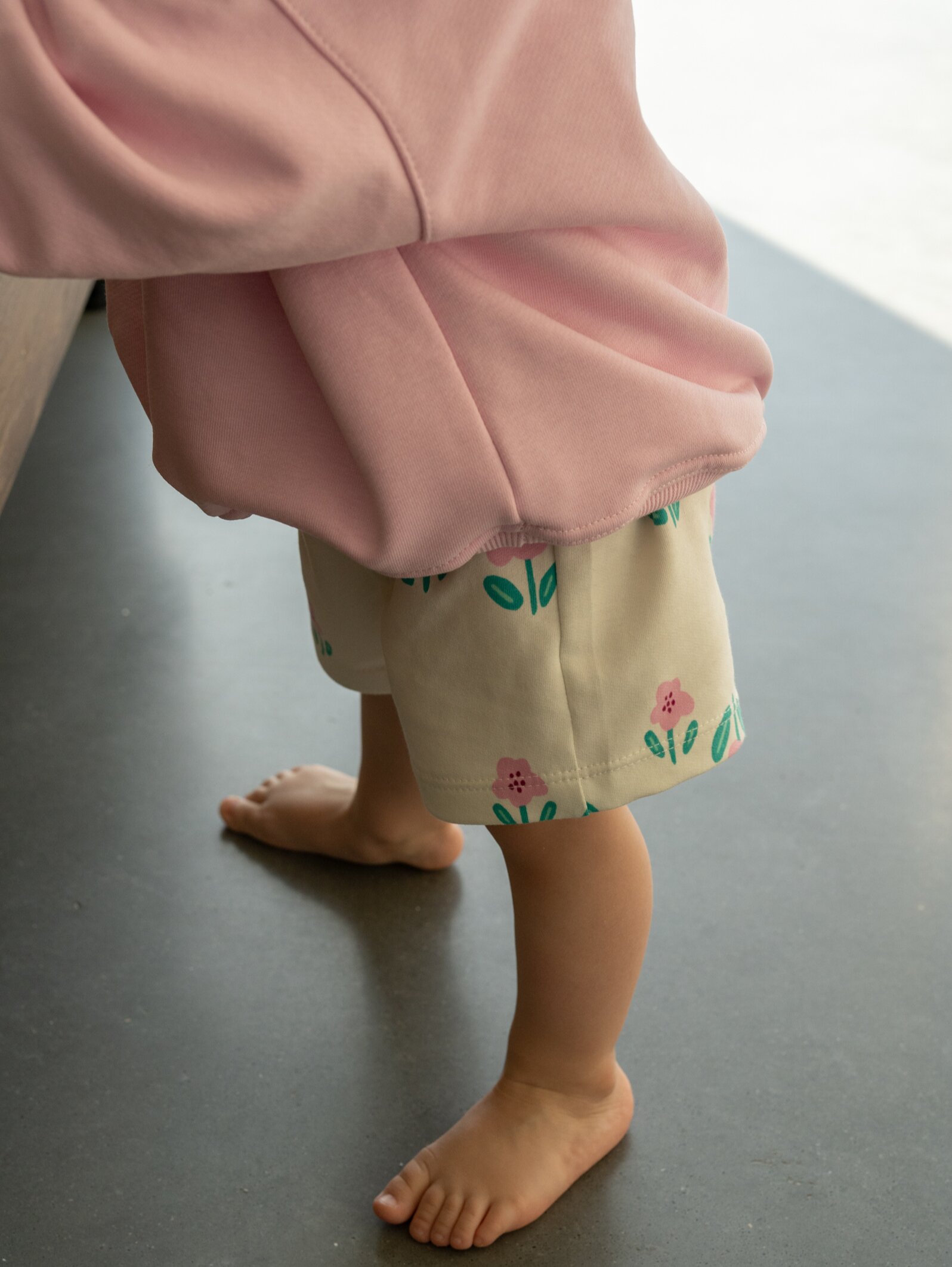 Kwiatowy print dodaje im wyjątkowego uroku i sprawia, że z łatwością wpisują się w garderobę kapsułową – pasują zarówno do jednolitych t-shirtów, jak i bluz z nadrukiem. Dzianina posiada certyfikat OEKO-TEX® Standard 100, co oznacza, że została przebadana pod kątem szkodliwych substancji i jest w pełni bezpieczna nawet dla wrażliwej skóry dzieci. Szorty powstają w Polsce – szyte przez doświadczone krawcowe w małej lokalnej szwalni, w warunkach pracy opartych na szacunku i uczciwym wynagrodzeniu. To ubranie z duszą i wartościami, które możesz podarować swojemu dziecku z czystym sumieniem.