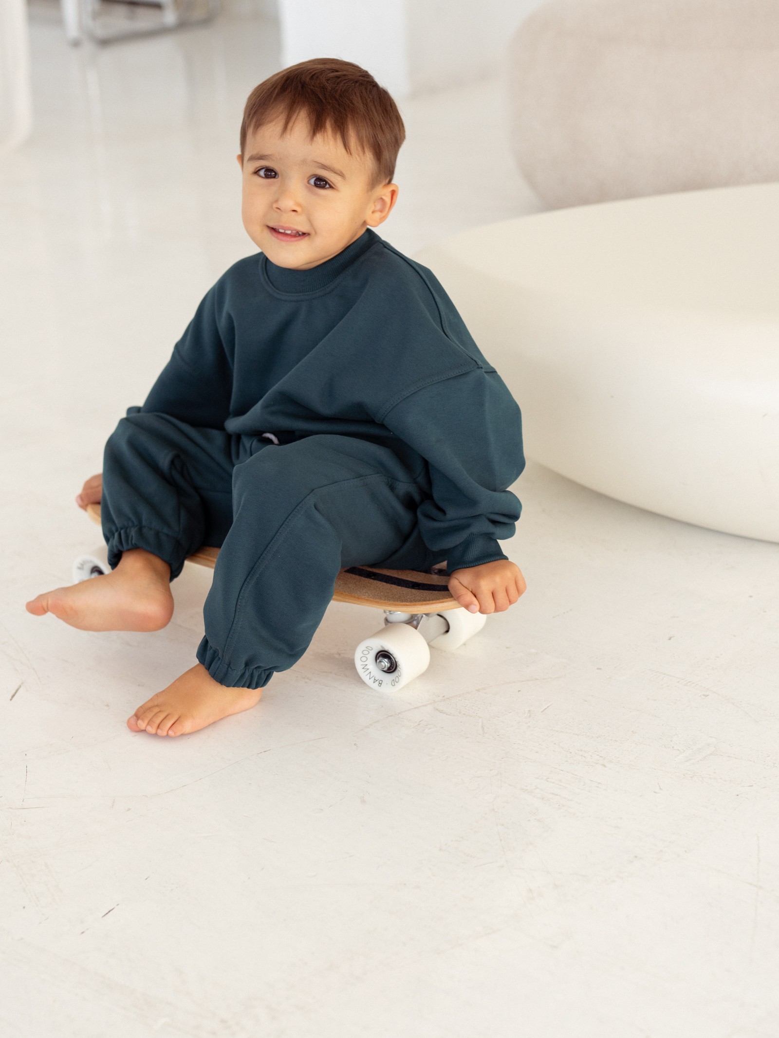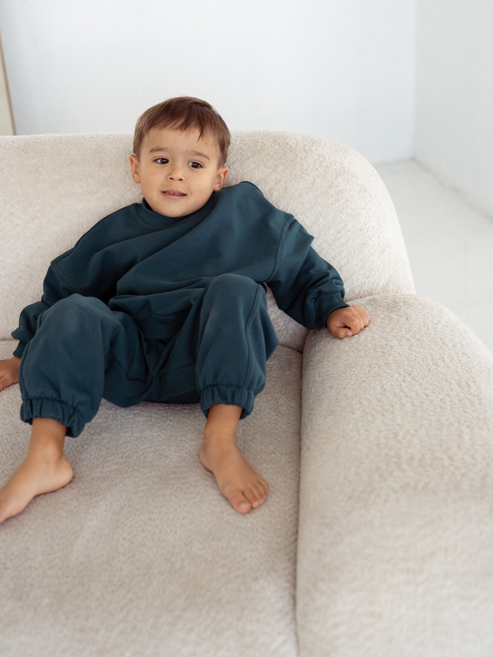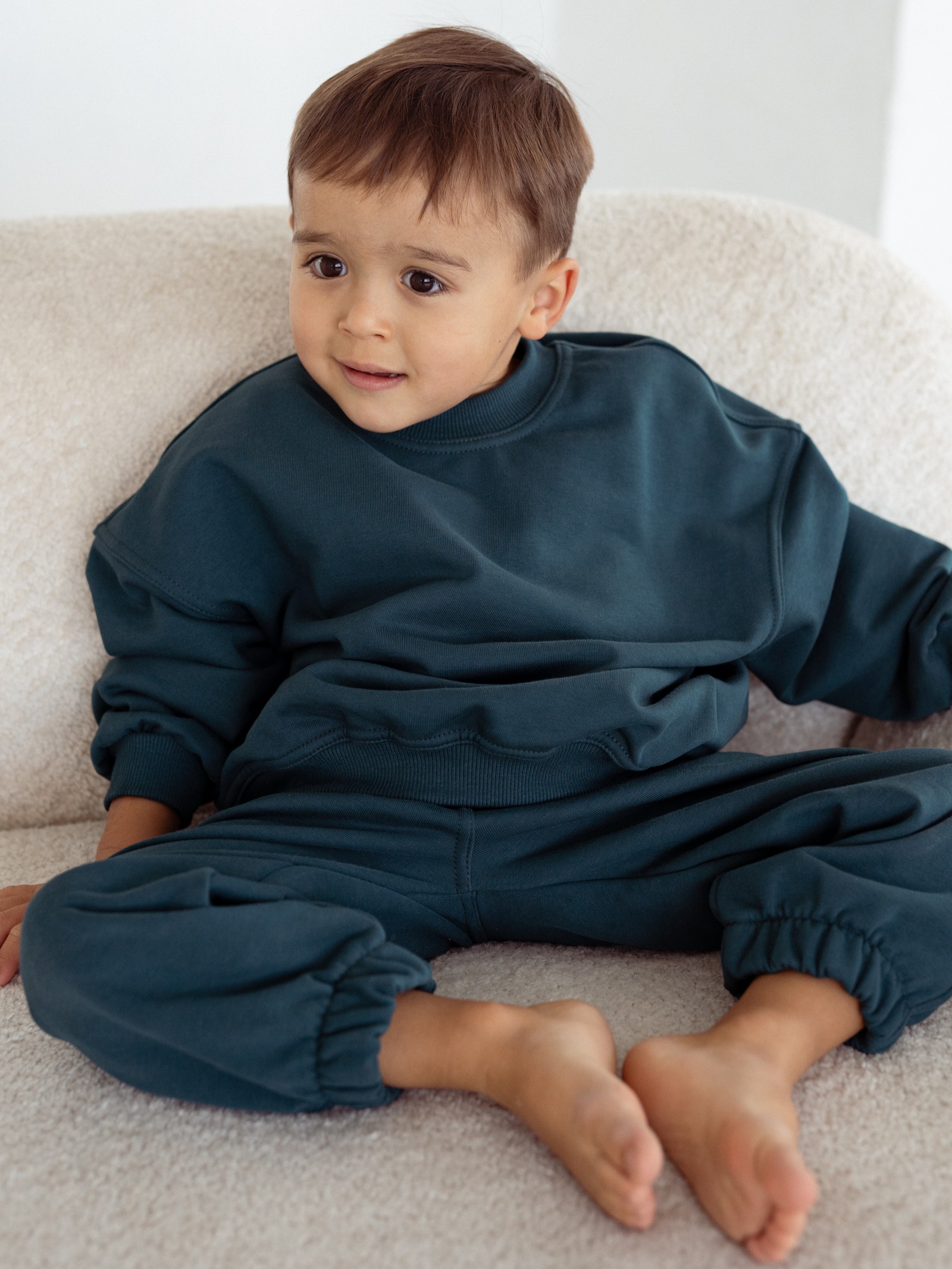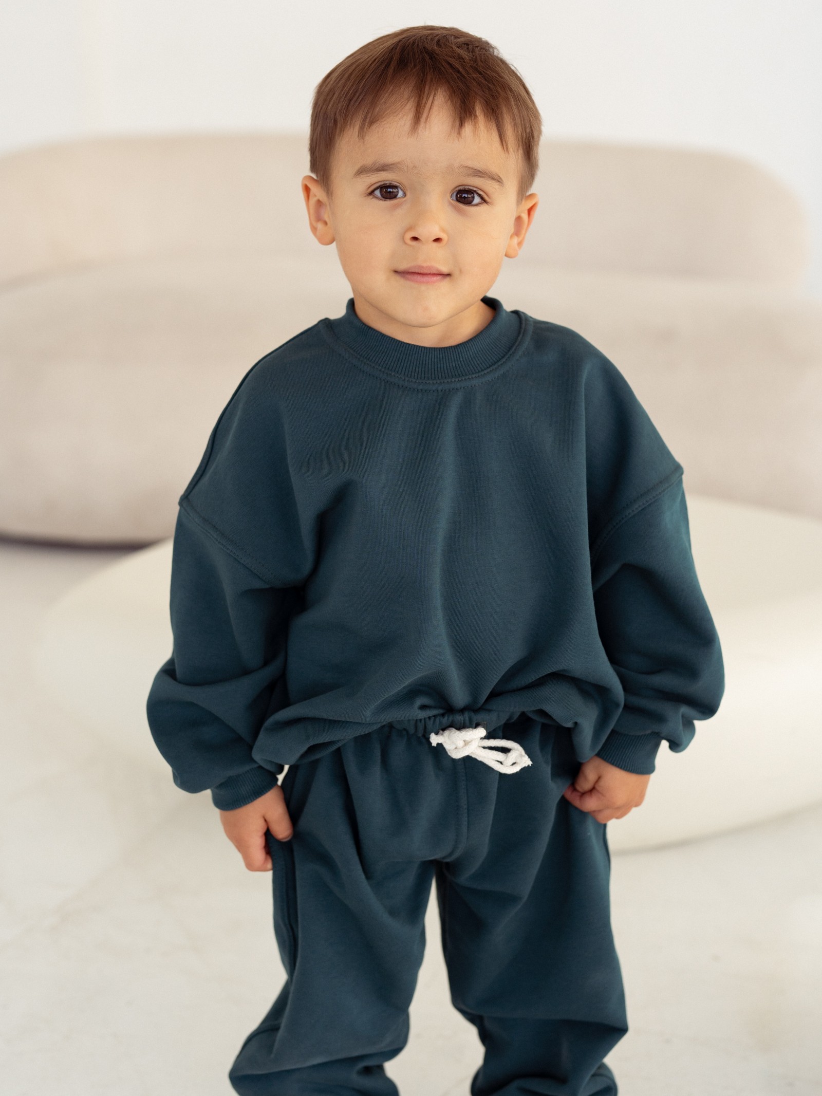 Spodnie dresowe dziecięce w kolorze głębokiej zieleni to idealne dopełnienie kapsułowej garderoby malucha. Uszyte z przyjemnej, mięsistej dzianiny dresowej z certyfikatem OEKO-TEX®, są w pełni bezpieczne dla skóry dziecka – bez chemii i drażniących substancji.